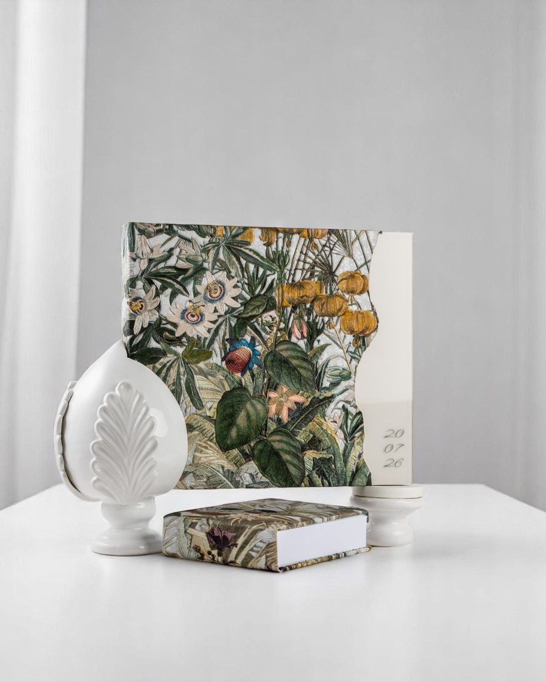 Realizzata in plexiglass ad alta trasparenza, questa copertina unisce la brillantezza del materiale alla stampa botanica dal carattere raffinato. Il pannello in plex dona profondità e luminosità all’immagine, esaltando ogni dettaglio del motivo floreale. Un design moderno ed elegante, ideale per chi desidera un album distintivo, decorativo e perfetto per valorizzare qualsiasi racconto fotografico.