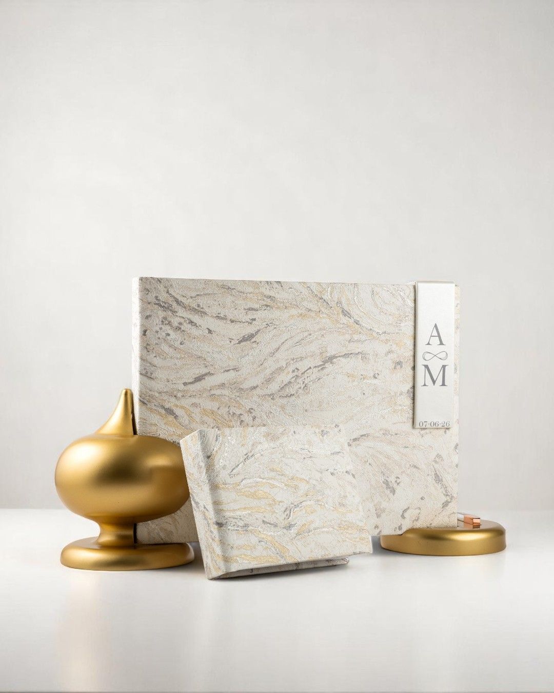 Perfetta per raccontare un matrimonio elegante, questa copertina unisce una preziosa texture marmorea a delicate venature dorate che donano luminosità e profondità alla superficie. La fascetta laterale pearlescente, personalizzabile con iniziali e data, aggiunge un dettaglio distintivo dal gusto contemporaneo. Un design raffinato e senza tempo, ideale per valorizzare gli album dedicati ai momenti più importanti.